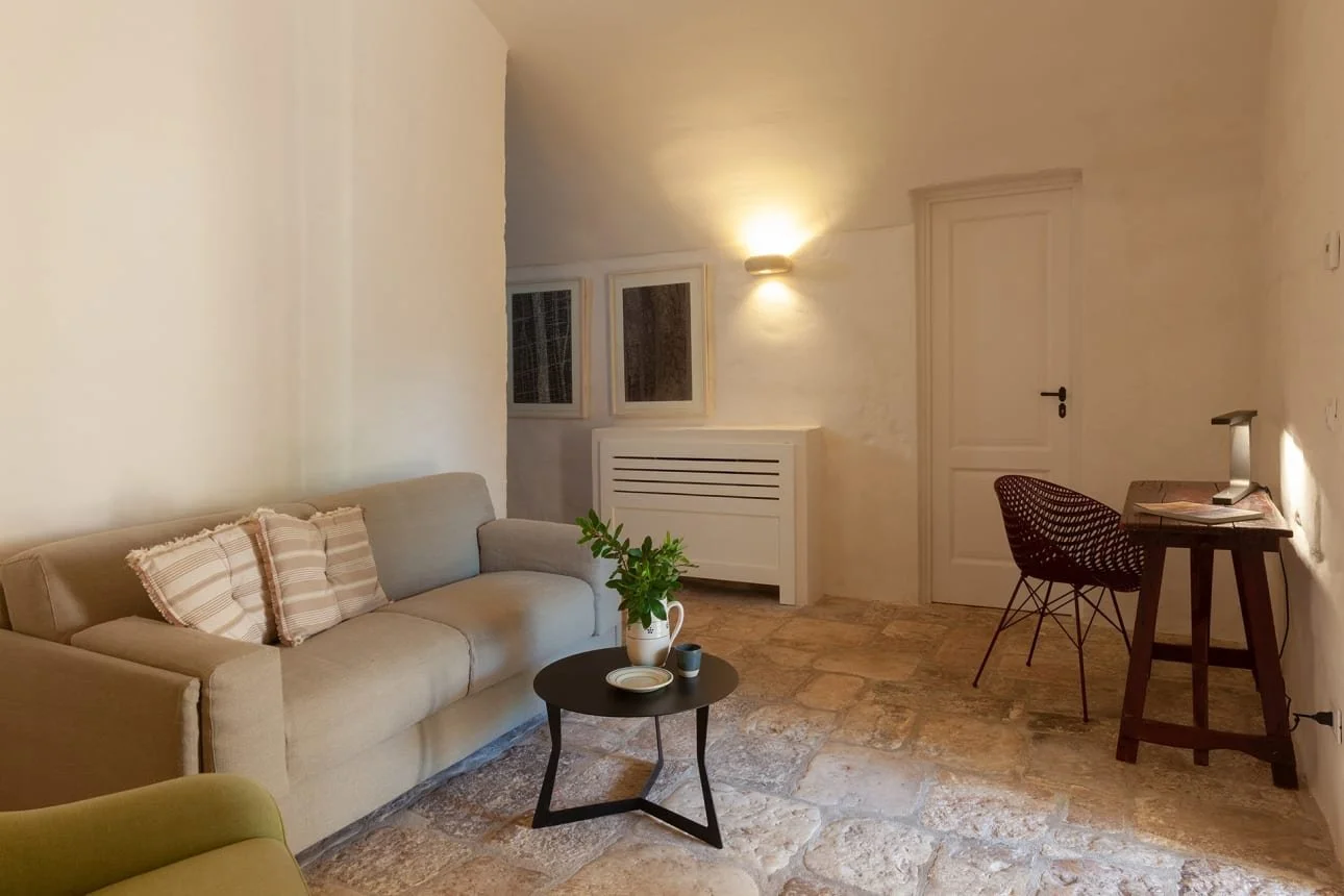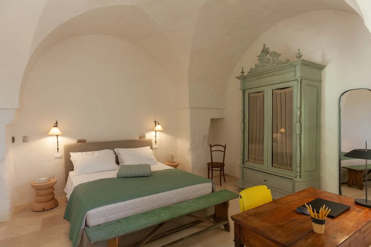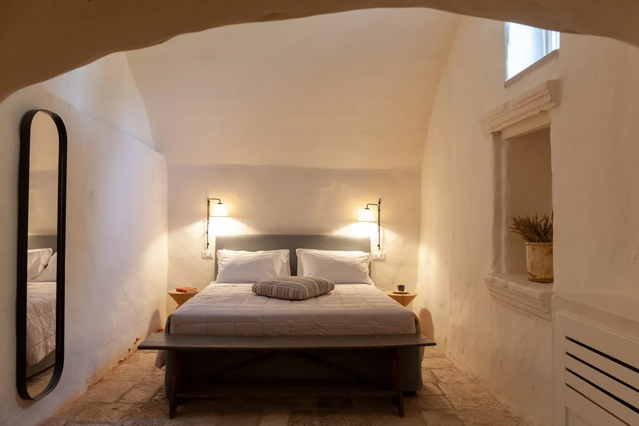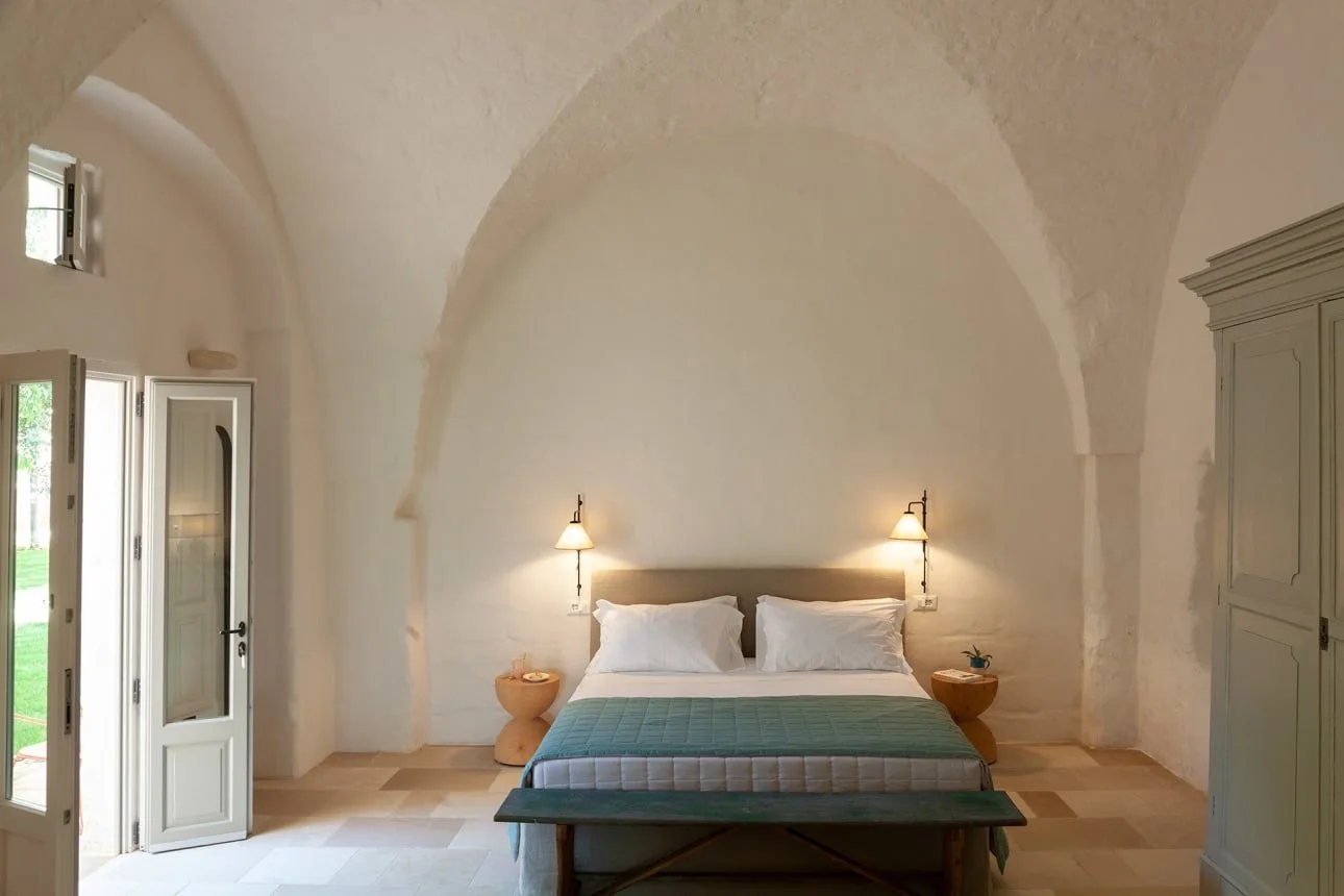 Our tours include accommodation at one of Puglia’s finest Villas. A superb choice for gatherings of family and friends, our villa is a beautifully restored masseria, thoughtfully refurbished to honour their heritage. The property features generously proportioned, character-filled interiors blending local craftsmanship with curated ethnic and contemporary pieces. Outside, the expansive walled grounds offer a sparkling pool, peaceful corners for al fresco lounging and dining, and acres of ancient olive groves to wander.